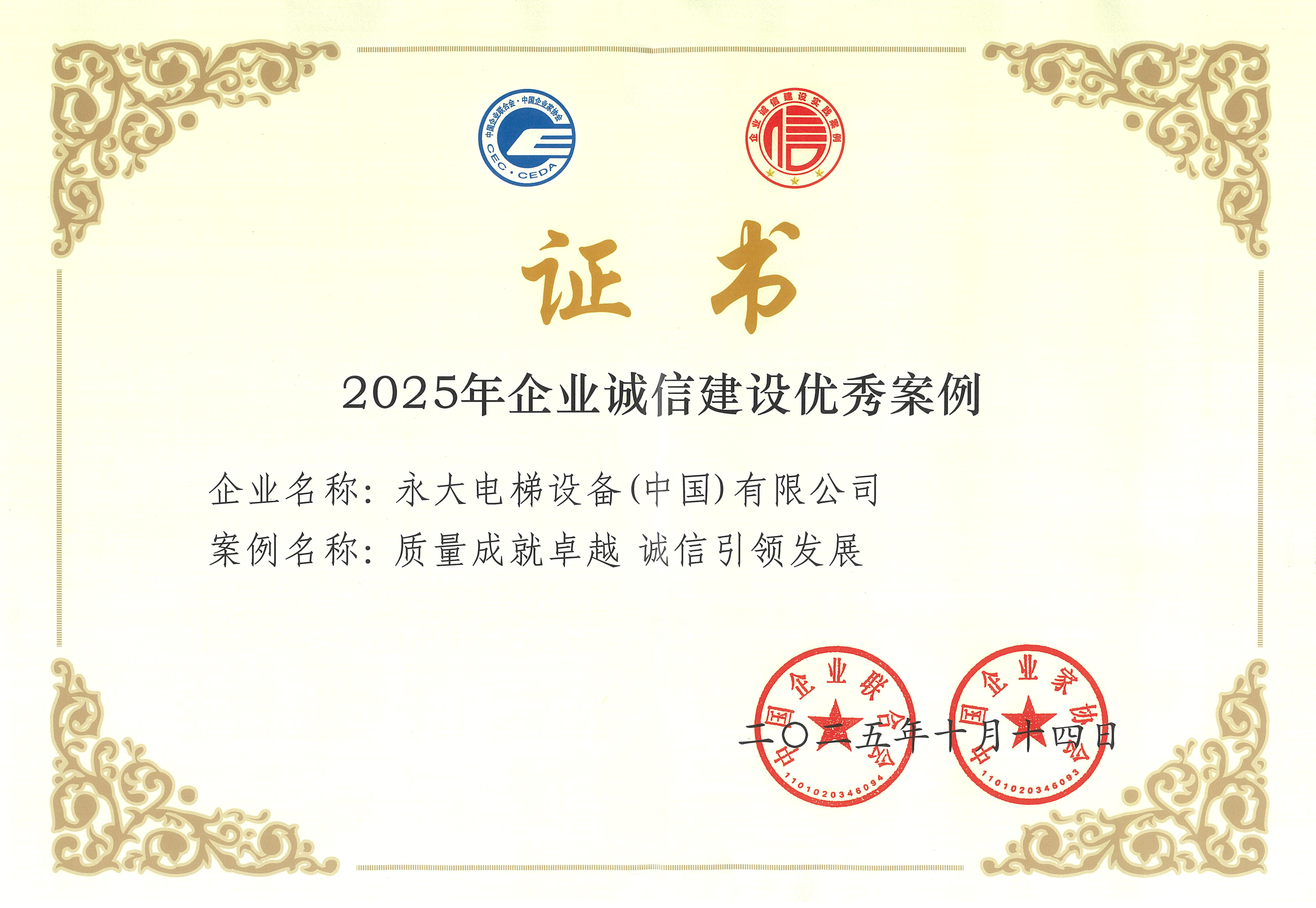 喜報(bào)!永大電梯榮膺全國2025年企業(yè)誠信建設(shè)優(yōu)秀案例